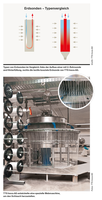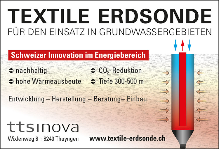 Dank innovativer Webtechnik ist eine Erdsonde auf dem Markt, die in Gebieten mit Grundwasservorkommen zulässig ist. Aufgrund ihrer koaxialen Geometrie bringt die neue Erdsonde eine höhere Wärmeausbeute als herkömmliche U-Rohrsonden. Die erste Anlage bewährt sich seit zwei Jahren in einem Pilotprojekt.Was haben farbige Kordeln, Fransen oder Bänder für Uniformen und Trachten mit Erdsonden gemeinsam? Die ausgeklügelte Webtechnik. In der Produktionshalle von TTS Inova in Thayngen, Schaffhausen, rattern 200 verschiedene Textilmaschinen. Eine davon produziert einen runden Schlauch, der als...