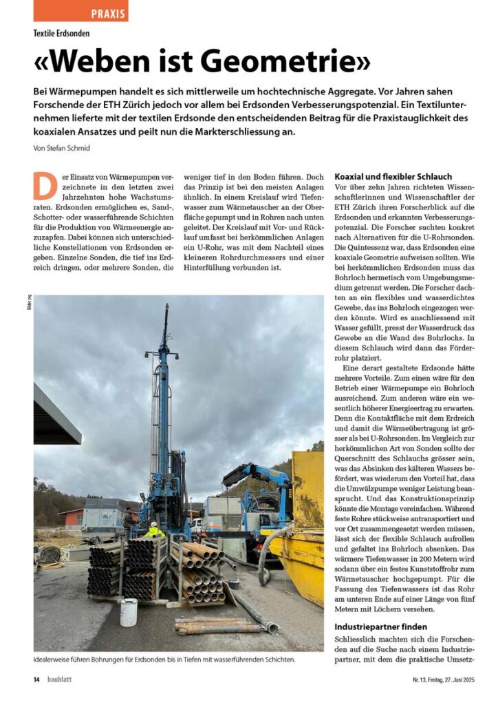Bei Wärmepumpen handelt es sich mittlerweile um hochtechnische Aggregate. Vor Jahren sahen Forschende der ETH Zürich jedoch vor allem bei Erdsonden Verbesserungspotenzial. Ein Textilunternehmen lieferte mit der textilen Erdsonde den entscheidenden Beitrag für die Praxistauglichkeit des koaxialen Ansatzes und peilt nun die Markterschliessung an.